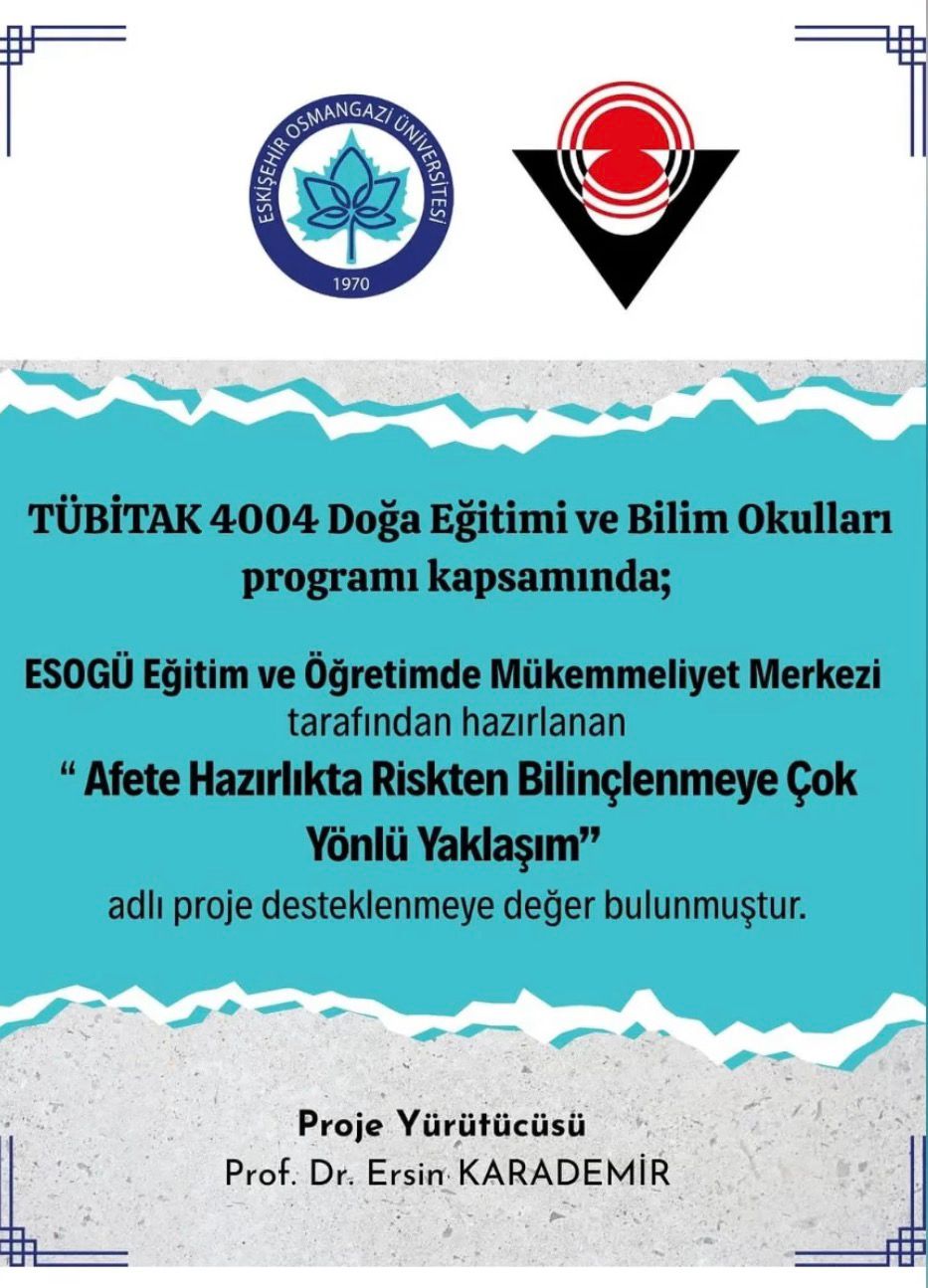 TÜBİTAK 4004 Doğa Eğitimi ve Bilim Okulları programı kapsamında; yürütücülüğü Prof. Dr. Ersin KARADEMİR tarafından yapılan “ AFETE HAZIRLIKTA RİSKTEN BİLİNÇLENMEYE ÇOK YÖNLÜ YAKLAŞIM” adlı proje desteklenmeye değer bulunmuştur.